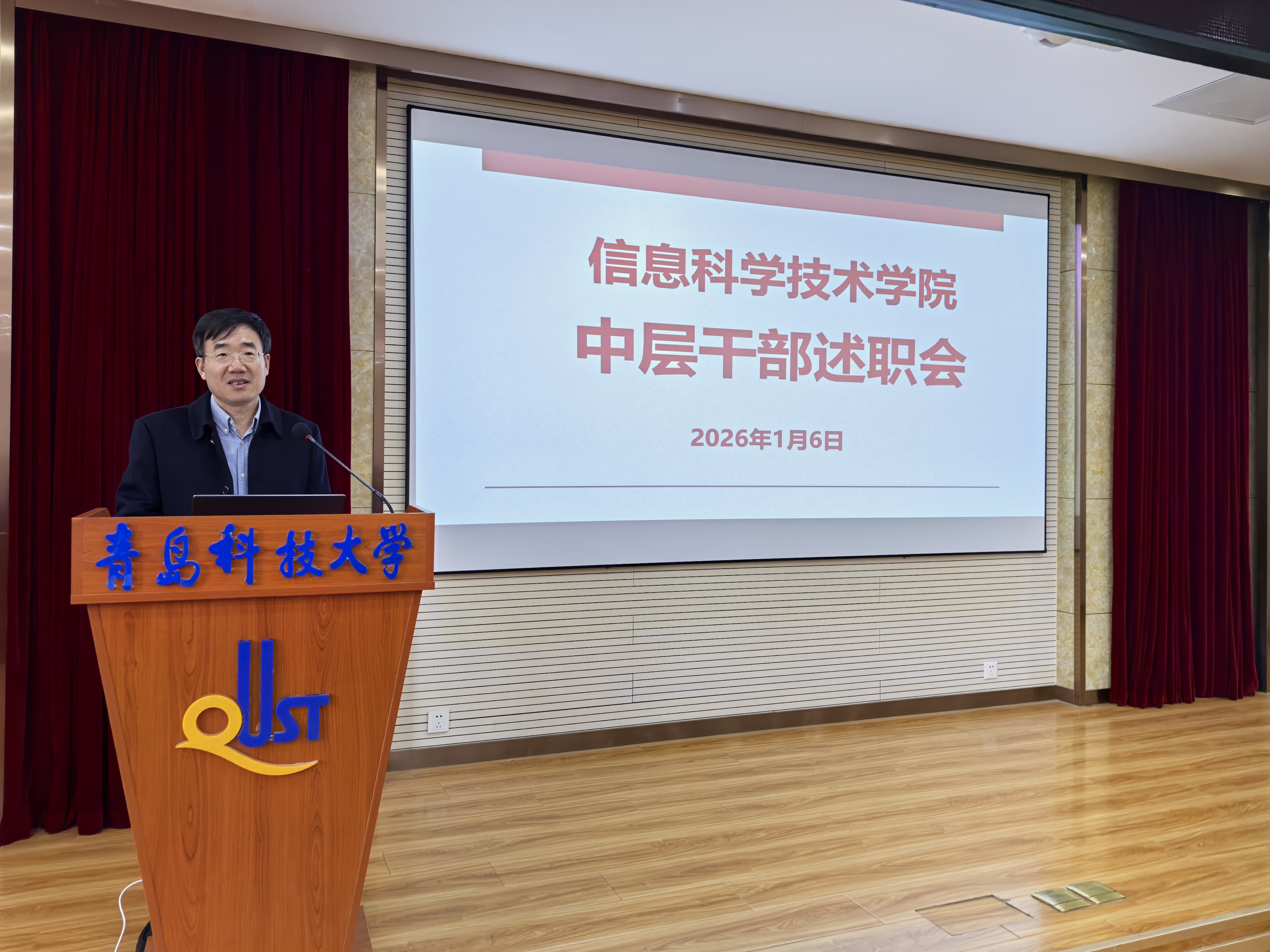 1月6日,信息学院在学院402报告厅召开中层干部年度述职会,学院领导班子成员及全体教职工参加此次会议。会议由学院党委书记许桂锋主持。
