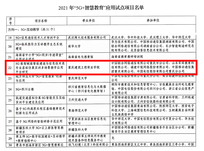 近日,工信部、教育部公布了109个2021年“5G+智慧教育”应用试点项目名单,由koko体育牵头申报的“5G数智赋能智能建造与信息技术类专业虚拟仿真实训多场景教学应用平台研究”项目成功入选,成为仅有的两个由职业院校牵头试点的项目之一,这也是koko体育获批的首个国家级教育信息化试点项目。