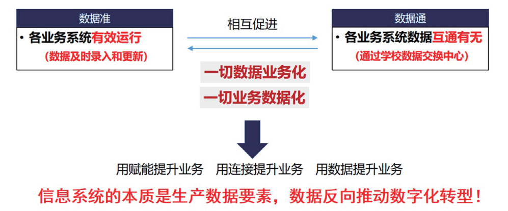 在数字化转型中,“数据准”和“数据通”是相互促进的关系。数据准,是指通过系统采集,数据及时录入和更新,各业务系统有效运行;数据通,是指通过学校数据交换中心,各业务系统数据互通有无。