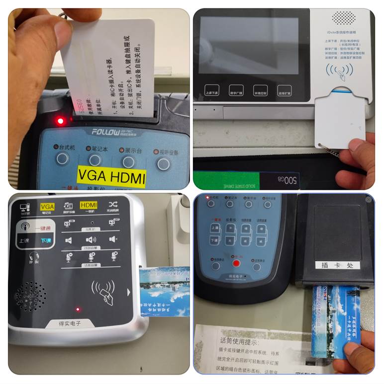 将讲柜中的卡片(向下或水平)插入中控插卡器中,教室设备将依次开启。插卡示例如下。