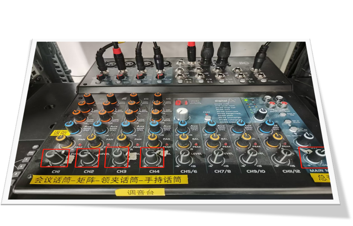 调音台上LEVEL是该通道的音量调节旋钮,根据调台上的标识通道名称调节该通道的音量大小,一般在数字0~5之间即可(已提前调好,通常不需要调整)。