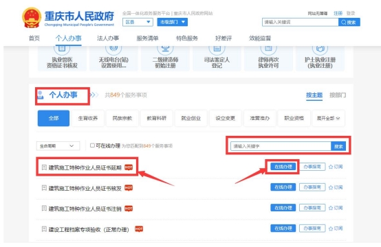 (一)登录账号后,点击“个人办事”然后下滑鼠标,在“个人办事”栏里选择“建筑施工特种作业人员证书延期”点击“在线办理”。