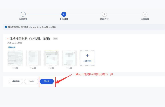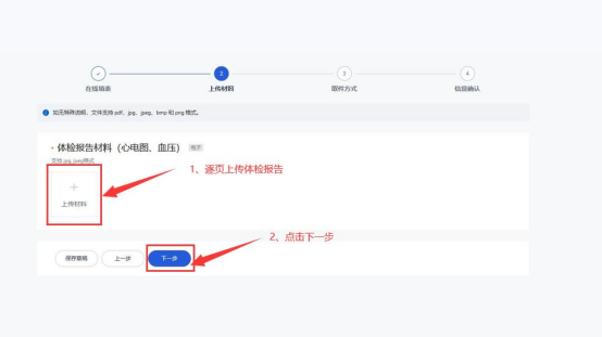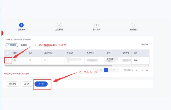 (三)选中需要延期的证书信息点击“下一步”,然后按要求逐页上传体检报告,点击“下一步”,确认上传资料无误后再点击“下一步”......最后点击“提交”,到此延期申请即操作完毕(如提示学时记录不足或未找到,请继续学习达到规定时长后再重新进行延期申请操作,学时关联有一周左右的延时)。