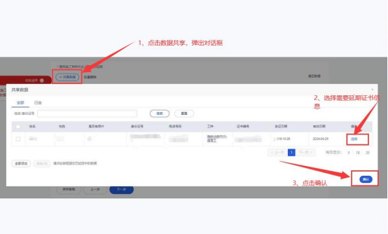 (二)点击“在线办理”进入办事后,页面显示如下图,点击共享数据,在弹出的对话框里选择需要延期的证书信息,点击确认。