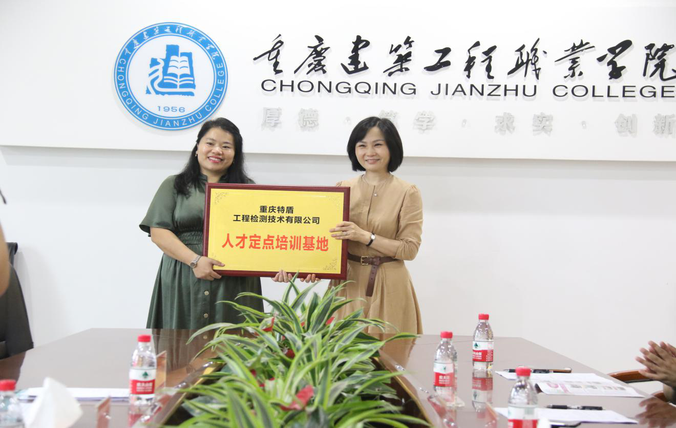 签约仪式上,刘院长与张总经理代表双方签署了校企合作协议。黄春蕾主任向刘星副总经理为“koko体育官网实践教学基地”和“重庆特盾工程检测技术有限公司人才定点培养基地”授牌。