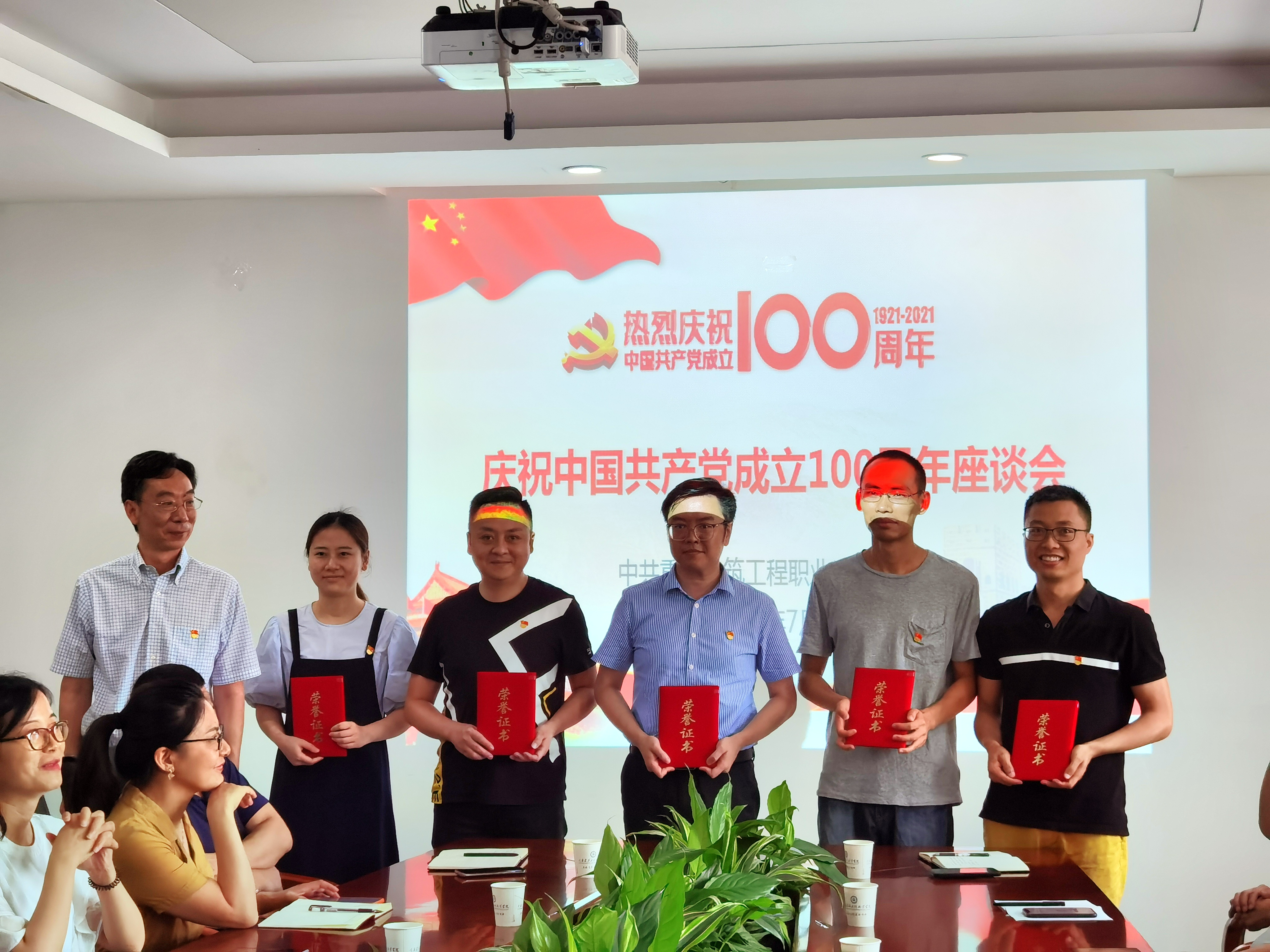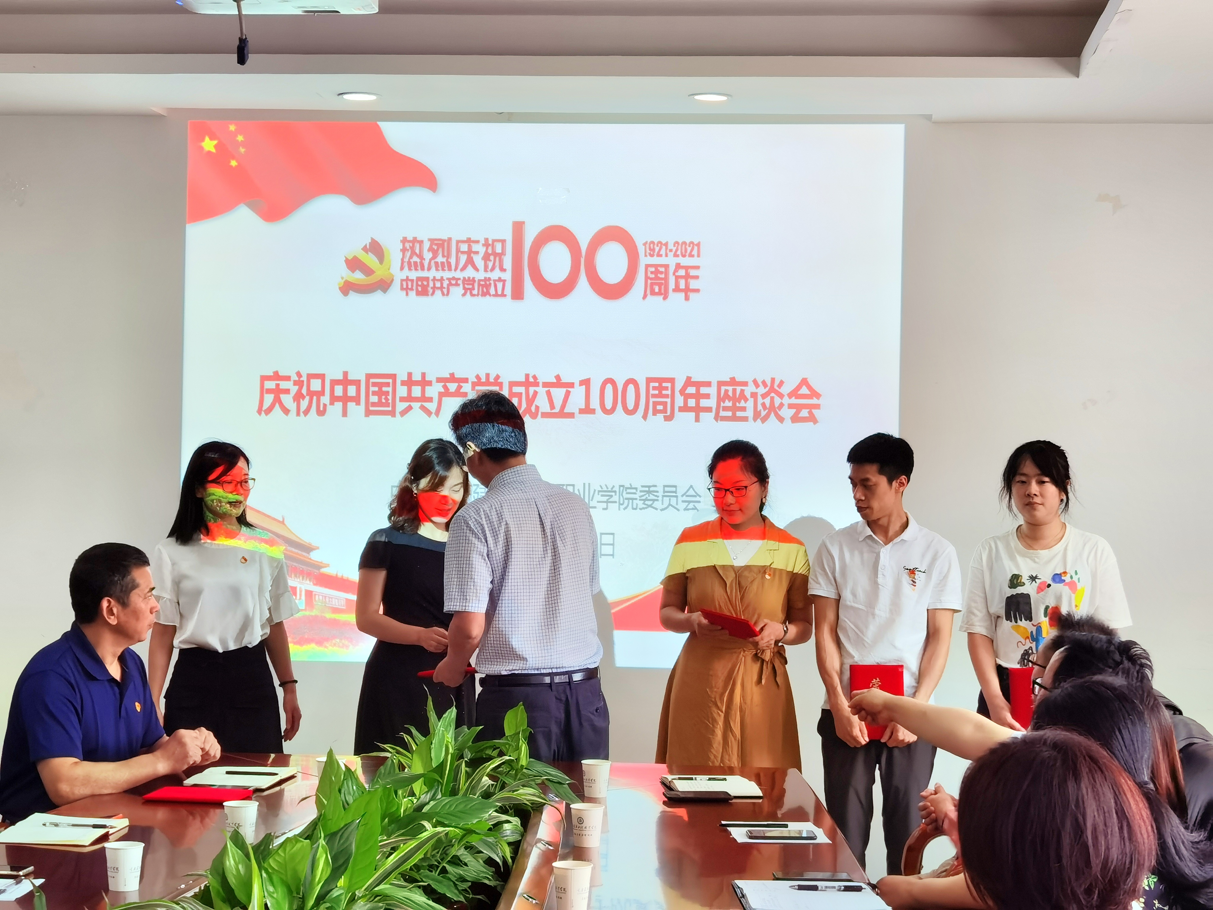 2021年7月7日,学校召开“庆祝中国共产党成立100周年”座谈会。党委书记邹晓波同志,党总支(直属党支部)书记,全国、全市、全校党建双创党组织书记,获得院级“两优一先”表彰的集体和个人代表,师生党员及入党积极分子代表,组织人事处、宣传部、纪检监察室负责人参加会议,会议由党委副书记龚群英同志主持。
