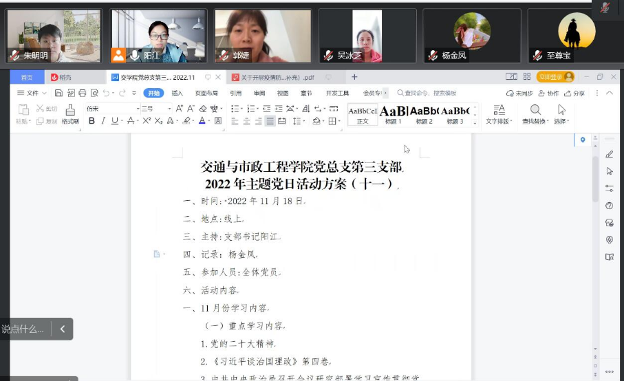 2022年11月19日,受疫情影响,交通与市政工程学院第三党支部11月主题党日活动在腾讯会议上召开,会议由支部书记阳江主持,支部全体党员参加。