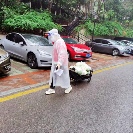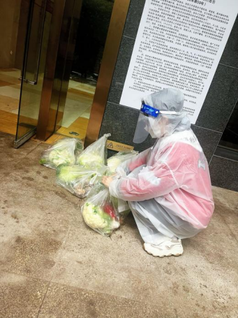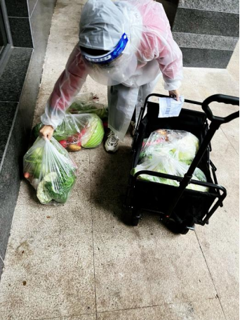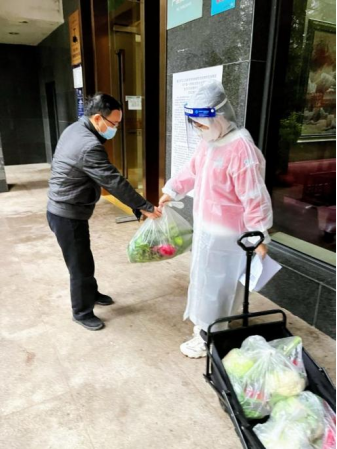 根据市政府新冠肺炎疫情防控工作新闻发布会精神,有疫情小区居民尽量足不出楼,采取线上下单和线下无接触式取物的方式采购生活物资。11月23日,杨金凤同志认真统计了本楼栋物资紧缺急需购买疫情期间保供蔬菜包的居民数量及他们分别购买的蔬菜包类别,又积极与社区蔬菜包采购志愿者对接,将楼栋居民购买的保供蔬菜包分批次、分类别从小区大门转送至单元楼下,分发给采购的居民。