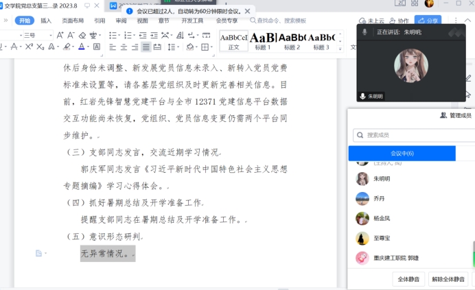 最后,党支部书记阳江提醒支部同志及时进行暑期总结、做好开学准备工作,进行了意识形态研判,本次会议为扎实开展主题教育专题组织生活会奠定了重要基础。