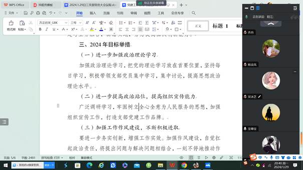 2024年1月29日,交通与市政工程学院党总支第三支部在腾讯会议召开全体党员大会,开展2023年度支部总结暨民主评议工作。