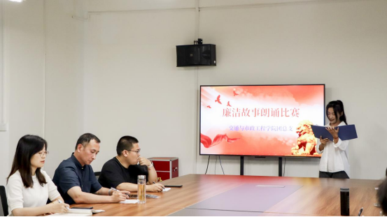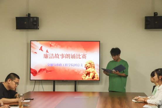 交通与市政学院工程学院团总支2023年6月7日在勤业楼A511教室开展“廉洁故事朗诵”为主题的朗诵比赛,本次比赛有幸邀请到交通与市政工程学院党总支书记杨晓东,学生办公室主任肖贤平,团总支副书记吉浩玮,担任评委。