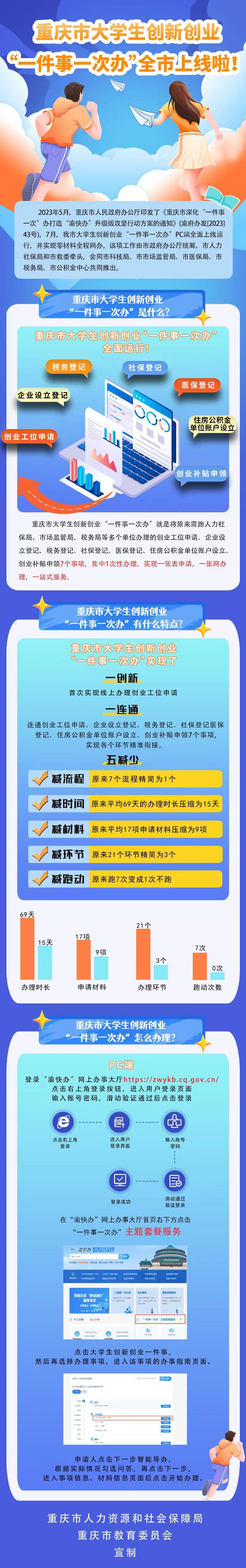 为了更好地服务大学生创新创业,在重庆市政府办公厅统筹下,重庆市人力社保局、市教委双牵头,会同科技、市场监管等部门以“一件事”为标准,通过事项梳理、流程优化、材料精简、数据共享、部门联动,将创业工位申请、企业设立登记、税务登记、社保登记、医保登记、住房公积金单位帐户设立、创业补贴申领等7项单项服务整合集成,推出“大学生创新创业一件事”主题套餐服务。