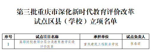 为贯彻落实中共中央、国务院《深化新时代教育评价改革总体方案》以及市委、市政府《重庆市深化新时代教育评价改革若干措施》要求,重庆市教育委员会组织开展了第三批重庆市深化新时代教育评价改革试点区县(学校)申报遴选工作。学校报送的“高职院校教师分层分类教育教学实绩评价改革”试点项目成功立项。