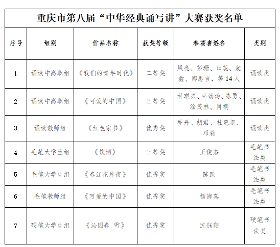 近日,重庆市教育委员会公布了全市大中小学生参加的重庆市第八届中华经典诵写讲大赛获奖情况,koko体育诵读类作品获得二等奖1项,三等奖1项,优秀奖1项;书法类作品获三等奖1项,优秀奖4项。