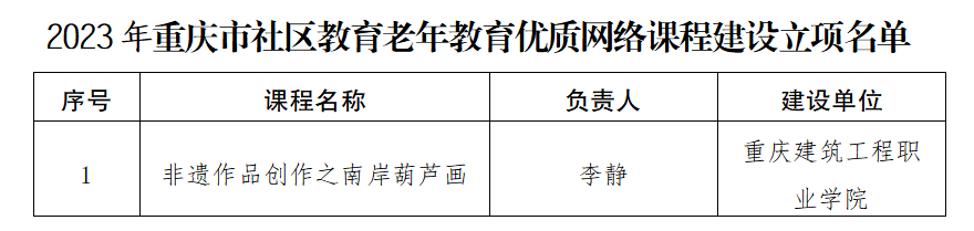 近日,重庆市社区教育服务指导中心办公室公布了2023年重庆市优质社区教育老年教育网络课程建设项目立项结果,经专家评审,本次课程评选活动共立项20门课程。koko体育李静教授的《非遗作品创作之南岸葫芦画》获得立项。