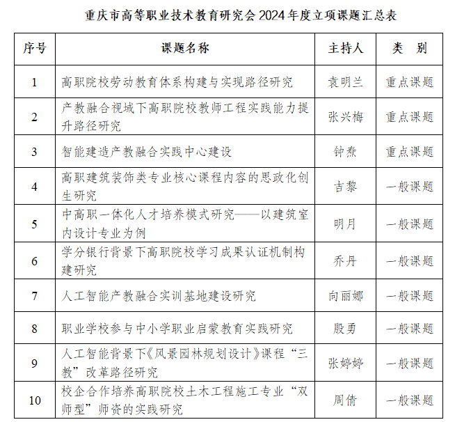 近日,重庆市高等职业技术教育研究会发布了《重庆市高等职业技术研究会关于2024年度科研课题立项的通知》(渝高职研发〔2024〕1号),学校申报的10个项目全部获批立项。其中,袁明兰教授的《高职院校劳动教育体系构建与实现路径研究》、张兴梅老师的《产教融合视域下高职院校教师工程实践能力提升路径研究》、钟焘老师的《智能建造产教融合实践中心建设》等3个项目被确立为重点课题,其余7项为一般课题。课题涵盖了课程建设、人才培养改革、产教融合、教师能力提升等多个方面。