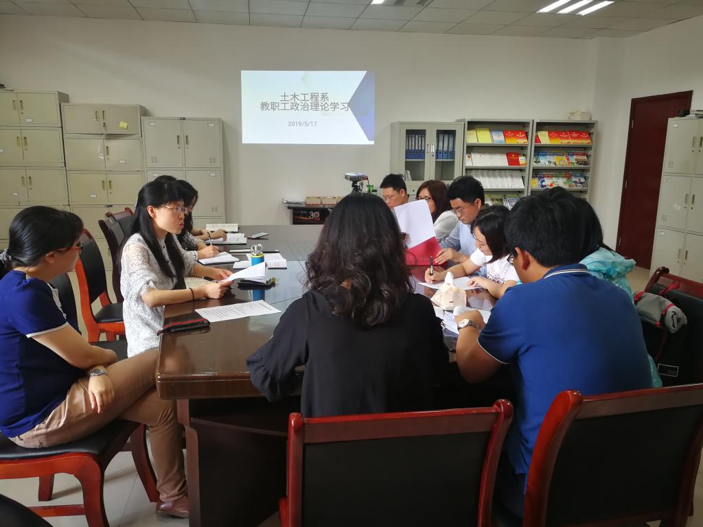 为进一步落实《koko体育官网教职工政治理论学习制度》(建工职院委〔2019〕32号)和上级相关的文件精神,提高教职工政治理论水平和思想觉悟,2019年5月17日,土木工程系组织全体教职工在2-223会议室开展了政治理论学习。会议由土木工程系党总支组织委员刘晓蓉主持。
