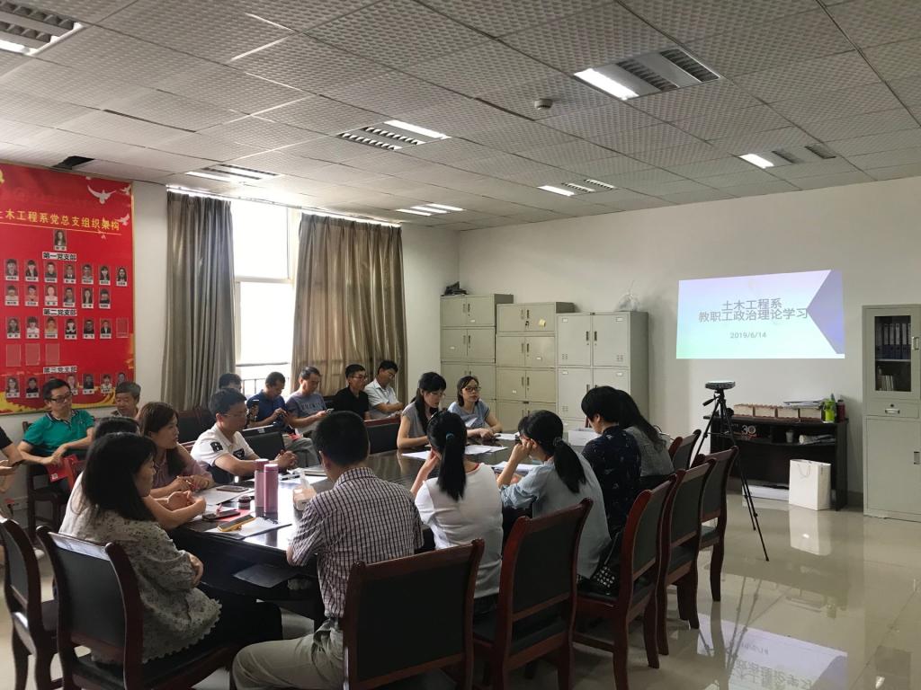 为进一步落实《koko体育官网教职工政治理论学习制度》(建工职院委〔2019〕32号)和上级相关的文件精神,提高教职工政治理论水平和思想觉悟,2019年6月14日,土木工程系组织全体教职工在2-223会议室开展了政治理论学习。会议由土木工程系党总支组织委员刘晓蓉主持。