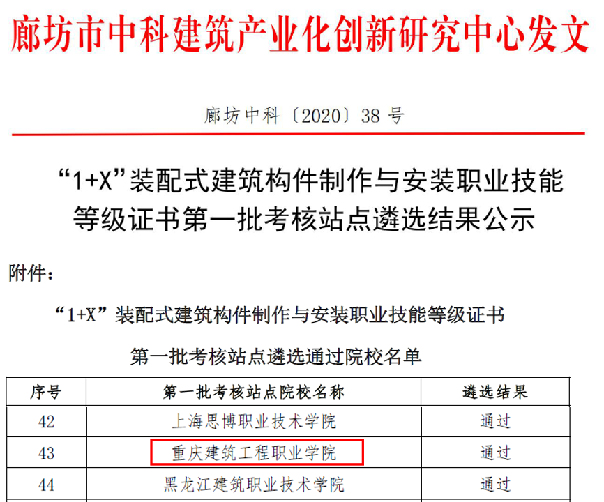 日前,廊坊市中科建筑产业化研究中心发布了“1+X”装配式建筑构件制作与安装职业技能等级证书第一批考核站点遴选结果公示,正式公布了全国首批入选的考核站点院校名单,我院成功入选“1+X”装配式建筑构件制作与安装职业技能等级证书第一批考核站点。