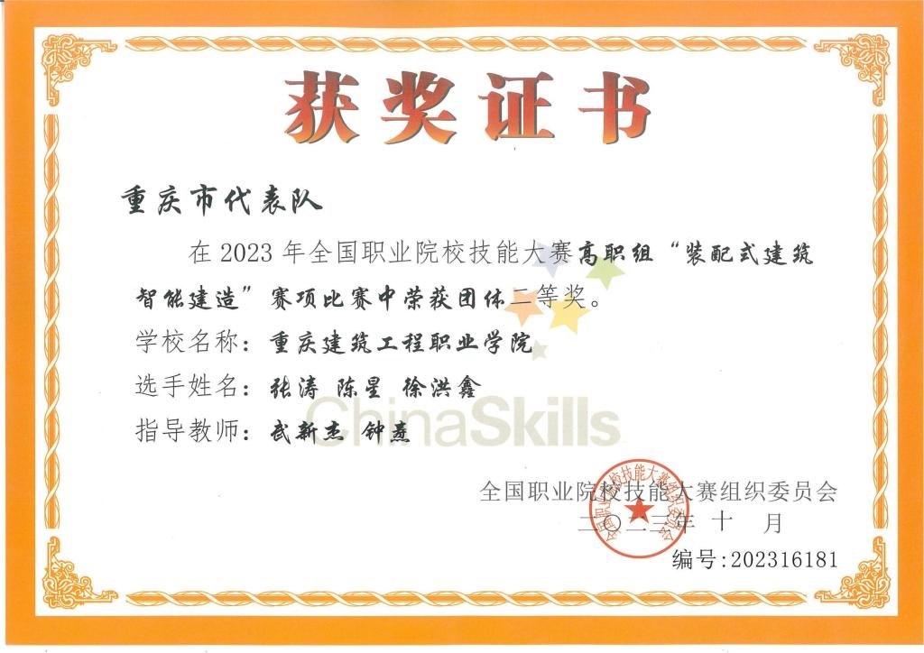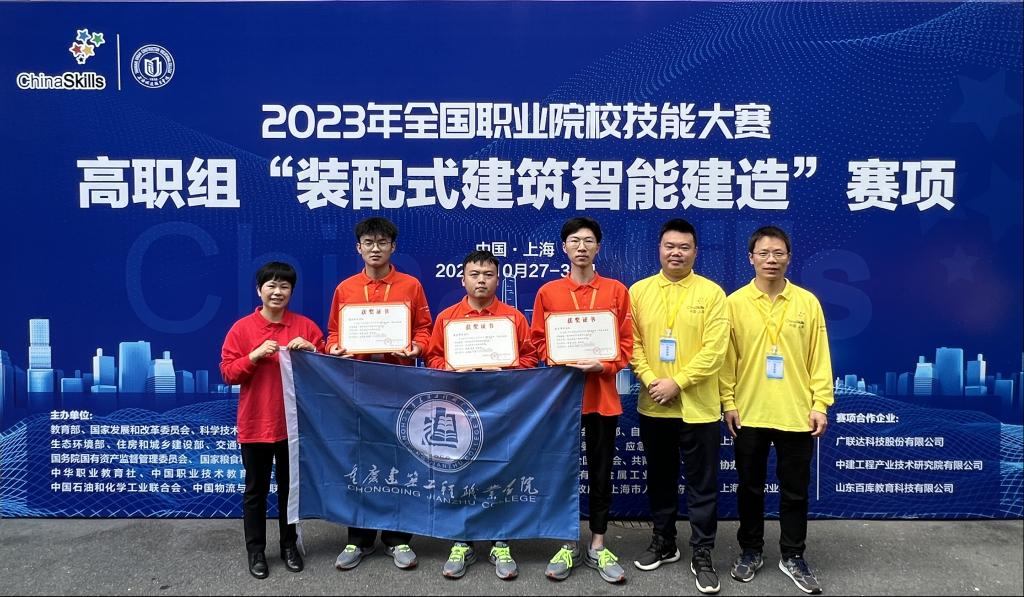 10月28日,2023年全国职业院校技能大赛(高职组)“装配式建筑智能建造”赛项(编号GZ008)决赛在上海拉开帷幕。koko体育智能建造学院由武新杰、钟焘两位老师指导的建筑工程技术专业张涛、陈星、徐洪鑫三名同学代表重庆市参加比赛,经过激烈角逐,荣获全国二等奖。