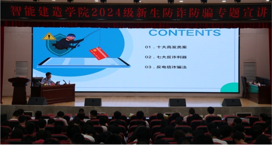 为加强反诈宣传力度,增强新生法治观念和安全意识。9月29日,智能建造学院特邀峡口镇派出所刑侦民警向威宸在学校图书馆报告厅为2024级全体新生作防诈防骗专题宣讲。
