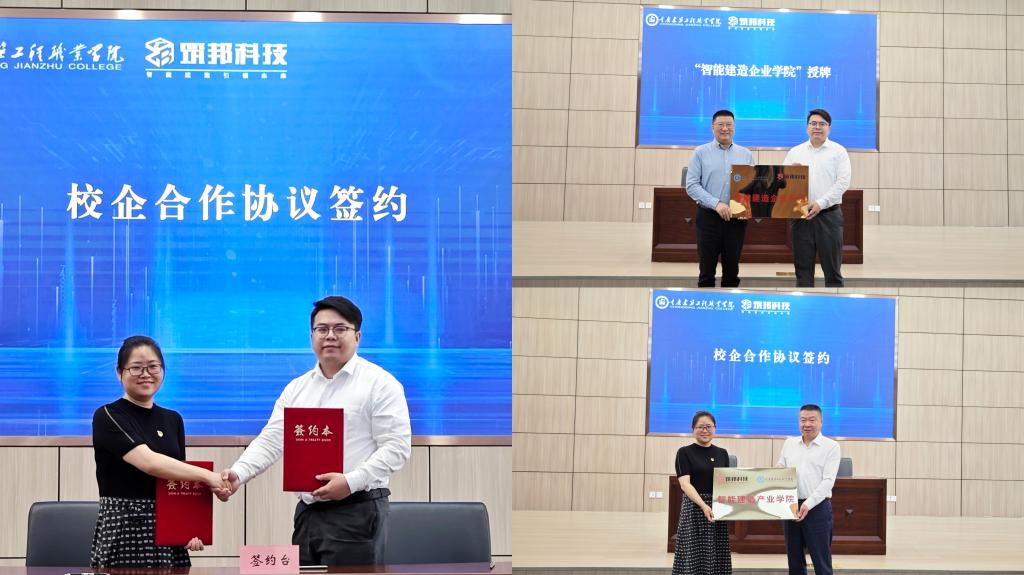 签约仪式上,校企双方签署了“校企合作协议”,并共同揭牌了“智能建造产业学院”和“智能建造企业学院”,为今后的深度合作奠定了基础。