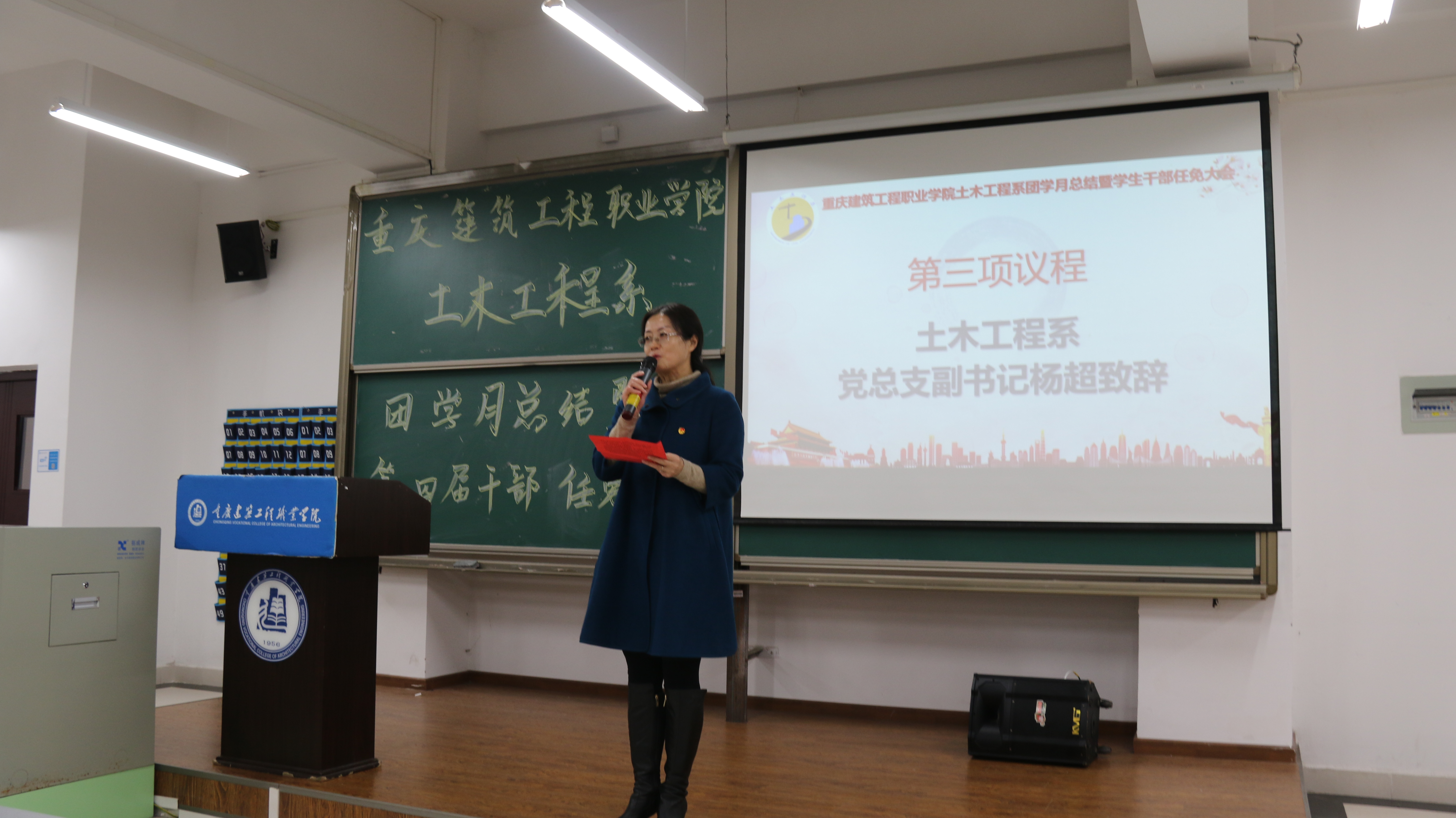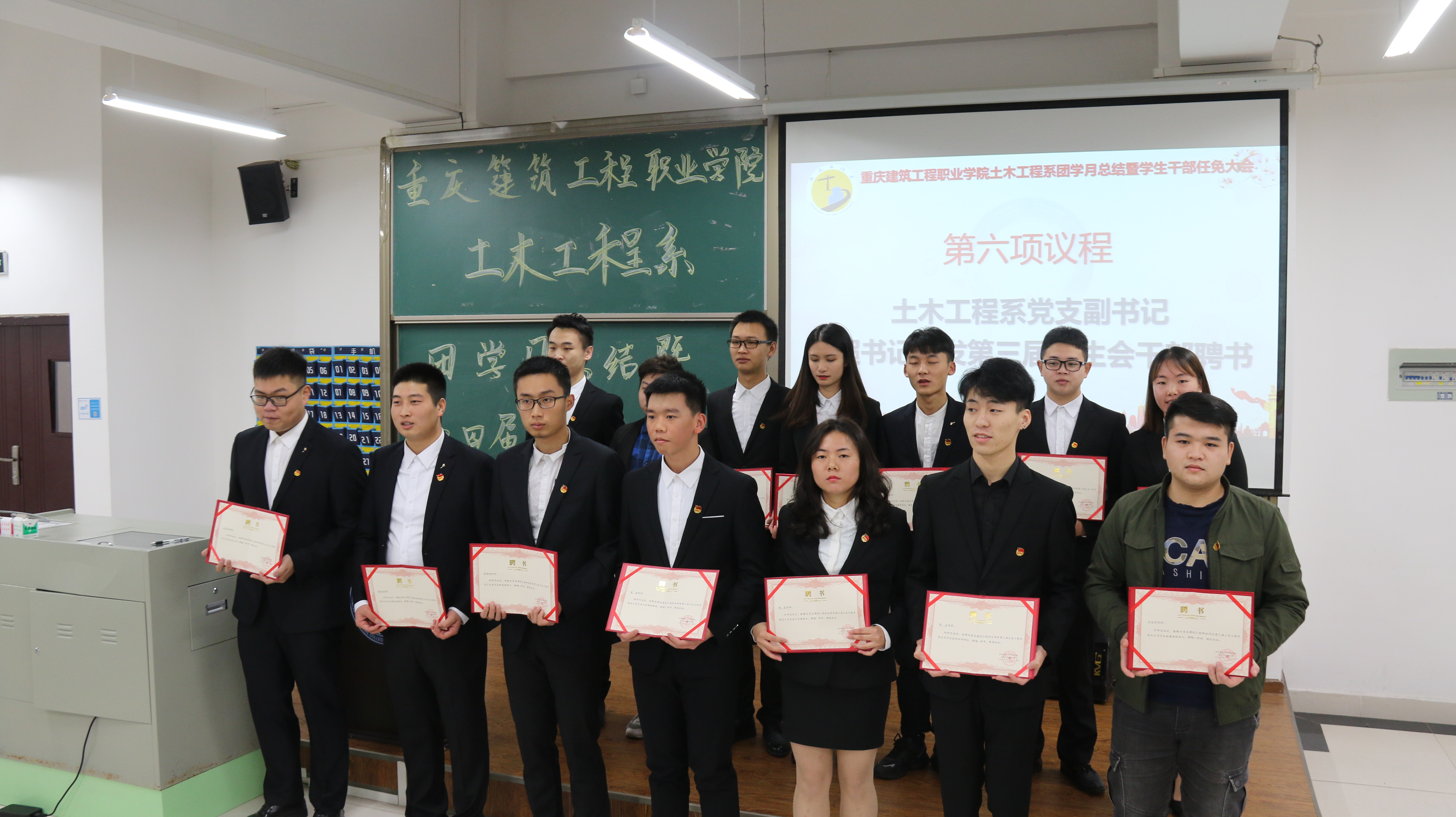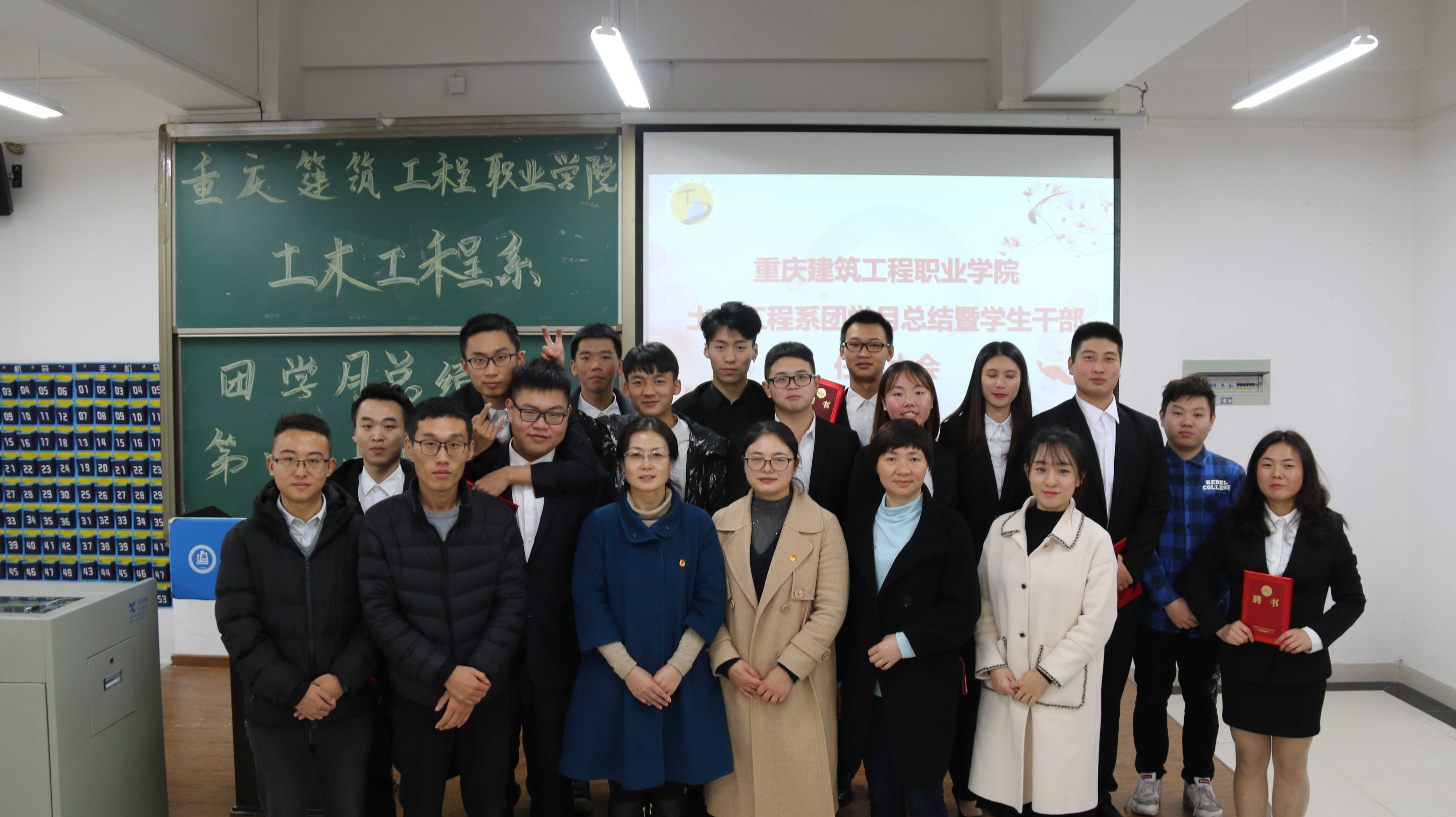 土木工程系团学月总结大会暨第四届干部任免大会于2019年11月25日中午12:30在5-208隆重举行,系党支副书记杨超、团总支书记覃群、辅导员刘鑫、刘兴硕、曹蒙、林丽琼以及各系部单位学生代表莅临现场。