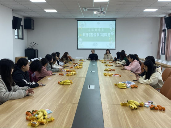 为引导我院女大学生树立正确的人生观、价值观、恋爱观,养成积极健康的生活方式,促进女生全面发展与健康成长,进一步做深做细女生的关爱与教育工作。我院于2023年3月2日12:30在建业楼406会议室召开了以“聆往昔经验,展巾帼风采”为主题的女生座谈会。此次座谈会由学工办主任刘晓蓉主持,辅导员代表、学院女生代表共计40人参加。
