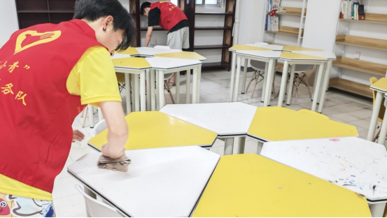 活动中,志愿者们分工协作,有的手持清洁工具,对党团活动室和学生自习室的宣传栏、桌椅、书架等区域进行细致擦拭,整理书籍与活动物资;有的清理地面纸屑并分类回收垃圾,更有同学贴心补充了公共纸巾、粉笔等用品。经过两个小时的劳动,原本杂乱的自习室焕然一新,桌椅摆放整齐、窗明几净,墙壁上还新增了“离座请带走垃圾”的暖心提示标语。