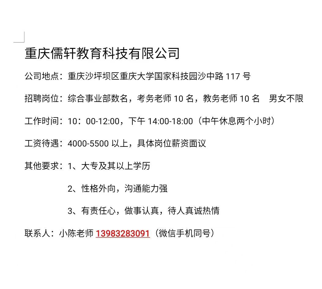 重庆儒轩教育科技有限公司 招考务人员 专业不限