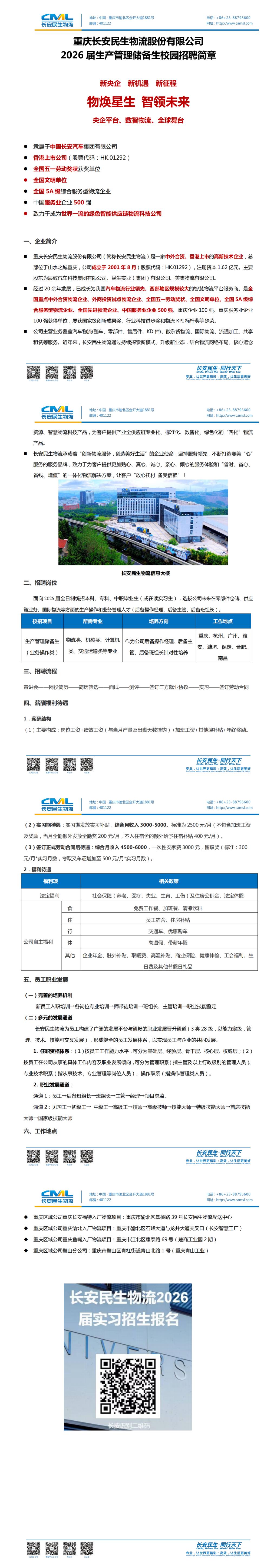 重庆长安民生物流股份有限公司2026届生产管理储备生校园招聘简章