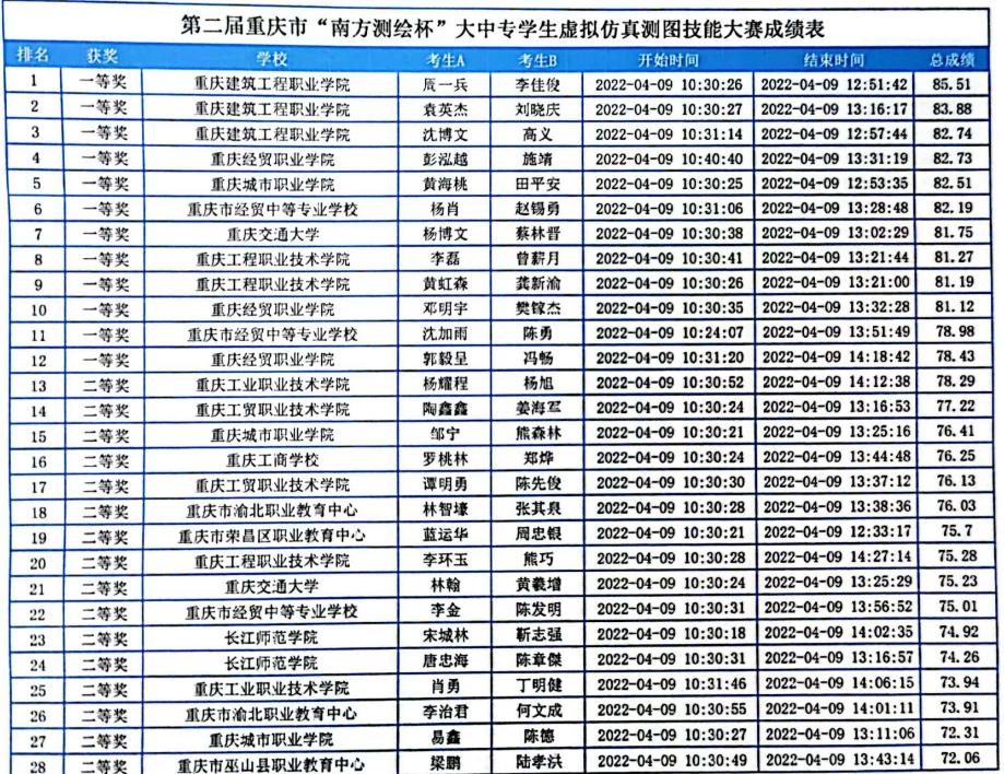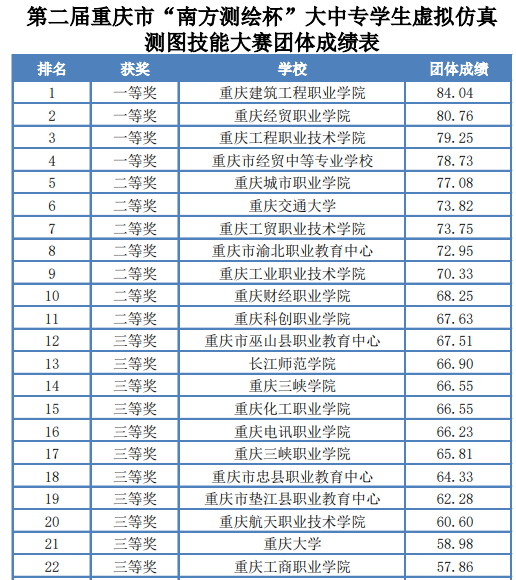 2022年4月9日,由重庆市规划和自然资源局、重庆市教育委员会组织,重庆市测绘地理信息学会、重庆市测绘地理信息职业教育集团主办,重庆工程职业技术学院承办,广州南方测绘科技股份有限公司协办的第二届重庆市“南方测绘杯”大中专学生虚拟仿真测图技能大赛正式开赛。来自重庆市本科、高职、中职36所院校共计118支队伍参加了本次大赛。