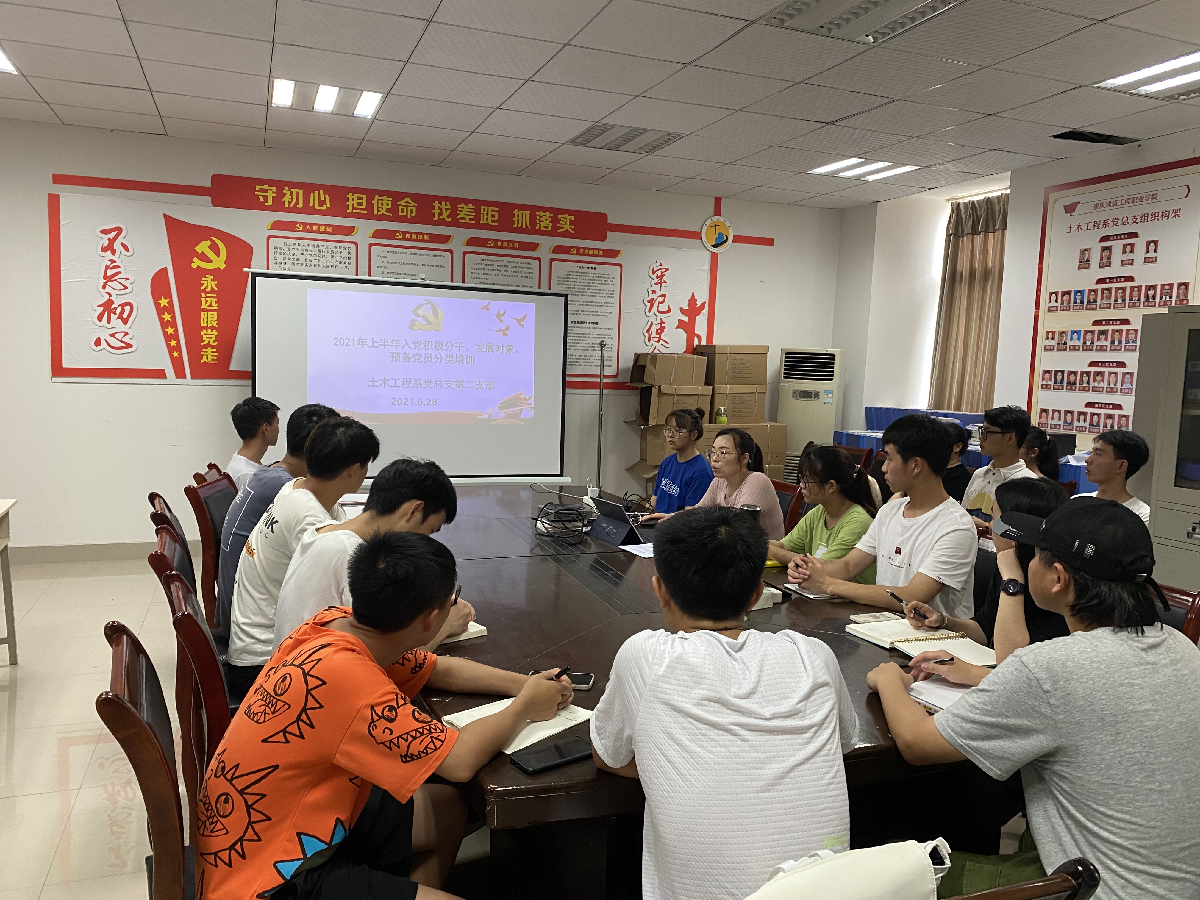为深入学习贯彻习近平新时代中国特色社会主义思想和党的十九届五中全会精神,切实加强入党积极分子、发展对象和预备党员的教育与培养,提升政治理论素养与水平,结合“学党史、强信念、跟党走”学习教育,土木工程系党总支于2021年6月28日-7月4日,开展了入党积极分子、发展对象和预备党员的分类培训。全体入党积极分子、发展对象和预备党员参会。