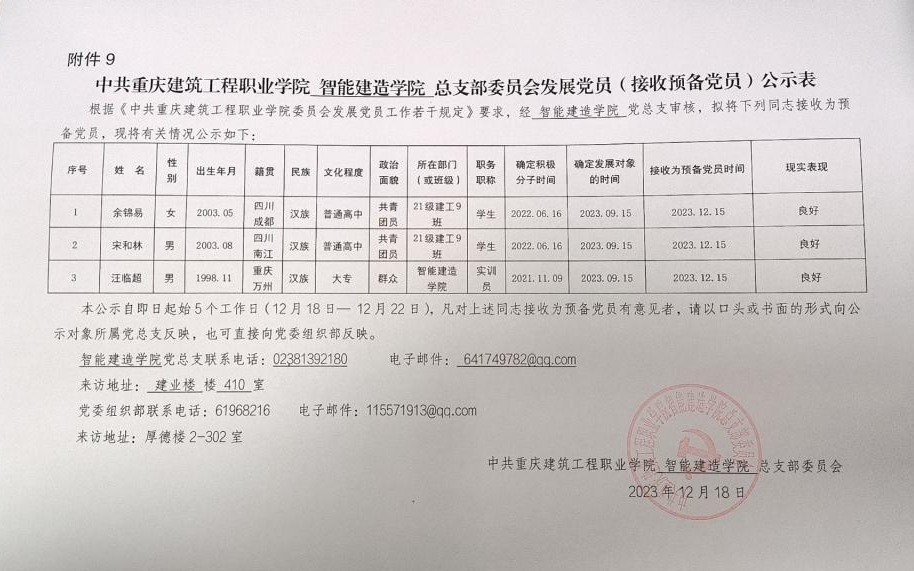 根据《中共koko体育官网委员会发展党员工作若干规定》要求,经智能建造学院党总支审核,拟将下列同志接收为预备党员,现将有关情况公示如下: