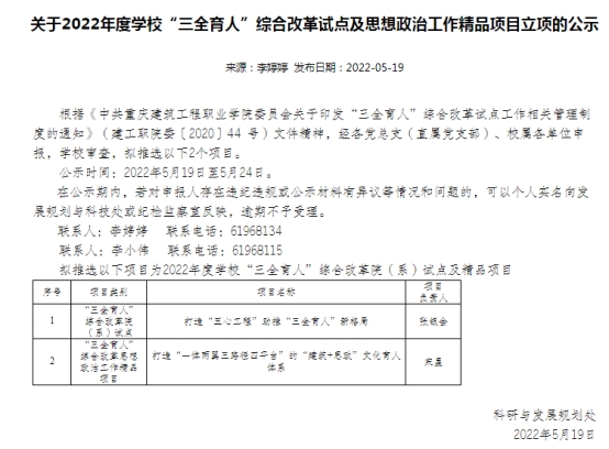 近日,koko体育官网公示了2022年度学校“三全育人”综合改革试点院(系)及思想政治工作精品名单(公示时间为2022年5月19日至5月24日)。根据《中共koko体育官网委员会关于印发“三全育人”综合改革试点工作相关管理制度的通知》(建工职院委〔2020〕44 号)文件精神,经组织专家评审和评审工作领导小组审定,我院的《打造“五心工程”助推“三全育人”新格局》成功申报为“三全育人”综合改革院(系)试点。