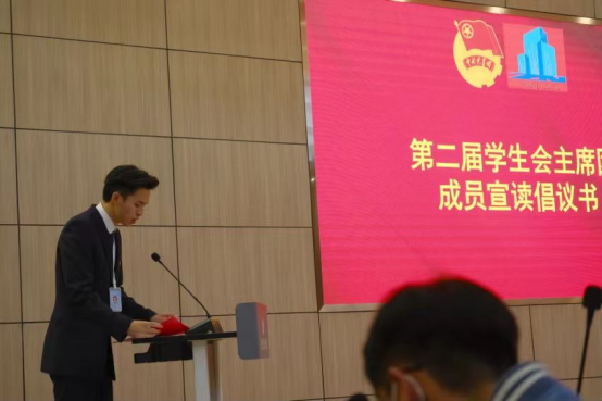 新一届主席团成员熊余发出倡议:“我们要在学院党总支的正确领导下,坚定理想信念,积极维护广大青年学生的各项权益,以饱满的热情全心投入到服务师生的工作中来,营造团结友爱、互帮互助的良好氛围,牢记‘匠心智筑、锲而不舍’的院训,为学院的发展添砖加瓦。”