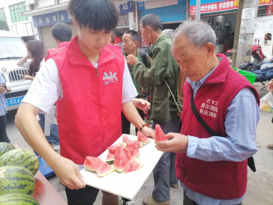 “亲爱的爷爷奶奶们、叔叔嬢孃们,这边瞧,这边看,冰糖麒麟瓜,口感清脆,香甜可口,平时3块钱1斤,今天特惠1元1斤,快来买哦!”随着一声声吆喝,“研学助农”乡村振兴促进团的师生们在磨子土家族乡的集市上开启了爱心助农卖瓜之旅。