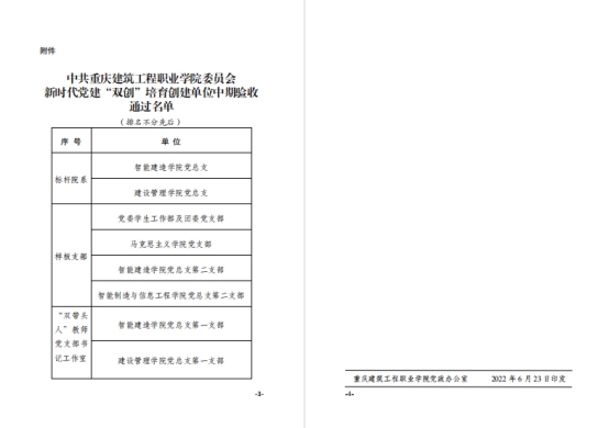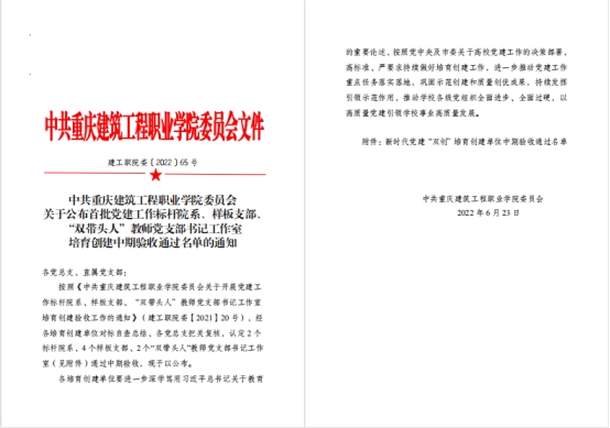 近日,学校公示了首批新时代“双创”培育创建单位中期验收通过名单。根据《中共koko体育官网委员会关于开展党建工作标杆院系、样板支部、“双带头人”教师党支部书记工作室培育创建验收工作的通知》(建工职院委【2021】20号)的文件要求,经组织专家评审和评审工作领导小组审定,总支党建工作标杆院系、样板支部、“双带头人”教师党支部书记工作室培育创建成功通过中期验收。