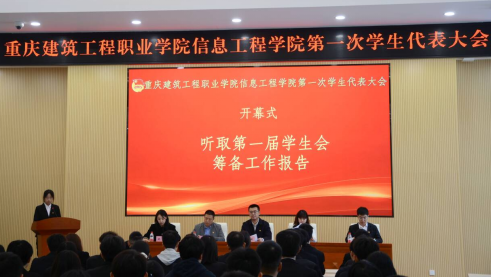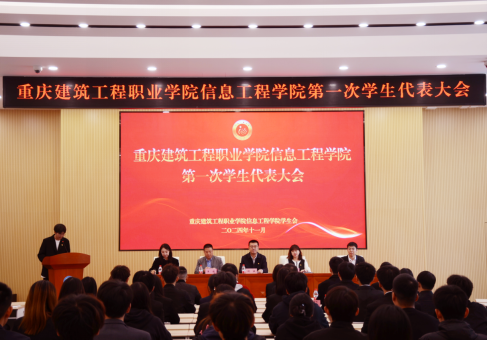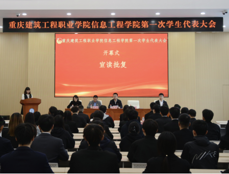 阔步新征程,谱写新篇章。为进一步加强学生管理,完善学生管理制度和维护学生权益,推动院学生会工作高质量发展,11月14日,信息工程学院第一次学生代表大会在学校思政厅顺利召开。信息工程学院党总支书记、院长别牧、党总支副书记李雪、办公室主任王毅、学工办副主任胡君、团总支书记刘晨,学院全体辅导员及来自设计学院、经管学院等兄弟学院6名学生会代表,全院72名学生代表参加开幕会。