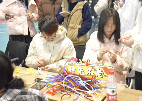 “智解字谜”区则考验参与者的文化功底。百余张字谜涵盖历史典故与传统文化知识,既有简单趣味题,也有需要深思的“烧脑”谜题。不少同学结伴挑战,现场欢声笑语不断。在“绯雪绒花”手工区,参与者亲手体验非遗技艺——绒花制作。通过熟绒处理、铜丝缠绕等步骤,一朵朵精致的绒花在指尖绽放。活动还设置了作品展示环节,师生们纷纷感叹传统手工艺的精妙与匠心。