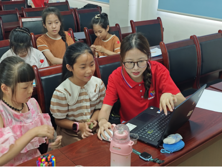 夏风携热忱,支教赴乡野。这个夏天,我随实践团奔赴重庆涪陵区珍溪镇,参与暑期支教活动,专门为当地留守儿童开设“AI科普课堂”。为了让课堂既专业又有趣,前期我们反复打磨课程方案,仔细调试教学软件,还精心准备了编程教具与激励奖品,只为给孩子们呈现最好的学习体验。课堂上,我们以沉浸式方式带孩子们走进AI世界:通过智能小产品制作实操,让他们触摸科技的温度;用趣味游戏拆解抽象的AI原理,化解理解难点;更手把手指导大家用Scratch编程,从零基础开始创作动画与简易游戏。尽管备课、授课的节奏紧张忙碌,但每当看到孩子们凭借自己的努力完成作品,脸上绽放出惊喜与自豪的笑容,我心中的充实感便油然而生。