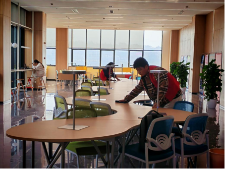 活动伊始,学生志愿者们迅速进入工作状态,现场分工明确、协作有序。有的专注擦拭图书柜,细致清理柜体缝隙中的灰尘;有的认真擦拭桌椅,确保桌面无污渍、无杂物;还有的专注清洁玻璃,力求让每一块玻璃都洁净透亮。擦拭过程中,志愿者们始终秉持一丝不苟的态度,不放过任何一个卫生死角,全力让图书馆一楼的公共设施焕然一新。图书馆工作人员也给予了大力支持,及时提供了抹布、清洁剂等必要清洁工具,为活动的顺利开展提供了有力保障。