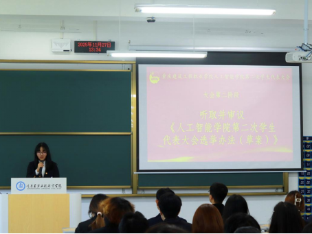 金秋硕果,盈盈枝满,建工校园,生机盎然。为进一步加强学生管理,完善学生管理制度和维护学生权益,推动院学生会工作高质量发展,11月27日,人工智能学院第二次学生代表大会在院党总支和校学生会的高度重视和关怀下顺利召开。人工智能学院党总支书记、院长别牧、党总支副书记李雪、办公室主任王毅、学工办主任胡君、团总支书记刘晨,学院全体辅导员及来自数字设计学院、财经商贸学院学生会代表,全院72名学生代表参加开幕会。
