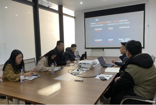 在重庆瑞网科技有限公司,调研组与相关负责人开展座谈。工程项目部叶经理以专门PPT,分享了该公司针对信息产品销售、工程项目售前工程师、项目实施交付工程师和售后维护工程师等岗位对应的技能、素质、职业证书的要求,还进一步介绍了该公司这两年招聘专科生进入到瑞网后的工作状态和发展情况。调研组与公司相关负责人就学生在校知识、技能、证书等各个方面的就业储备进行充分的交流探讨。