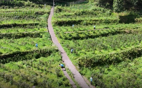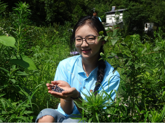 抵达蓝莓谷后,映入眼帘的是占地约130亩、依山势呈梯田式布的蓝莓园。园中蓝莓果实颗颗饱满,色泽诱人。实践团迅速投入工作,协助村民进行采摘,大家分工协作,配合默契,看着满筐的蓝莓,团队成员成就感满满。