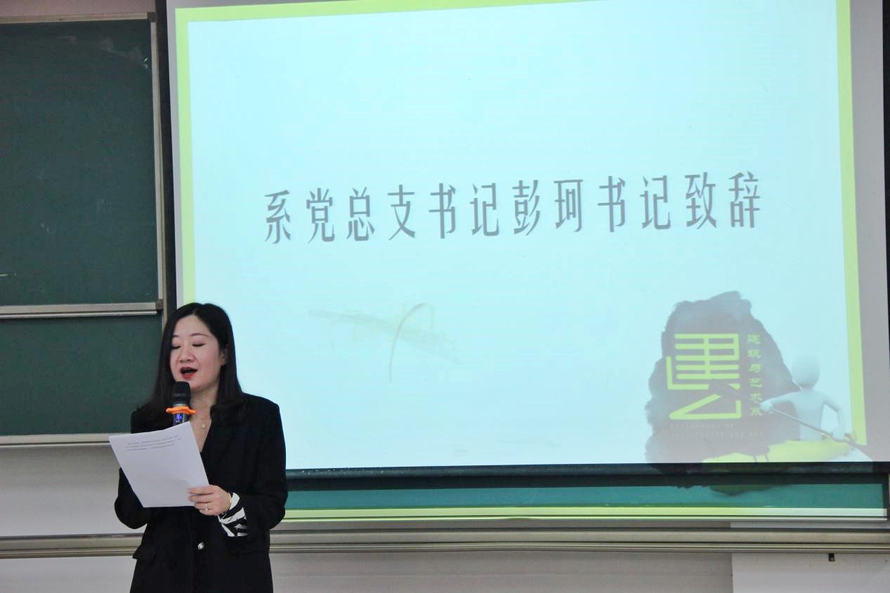 随后党总支书记彭珂上台讲话,对系部新生力量的注入表示热烈的欢迎,并以家长的身份肯定了新一届学生会的工作,提出了几点要求和希望,要求学会处理工作与学习的关系,增强责任担当,积极履行干部职责,共同创造建艺美好未来。