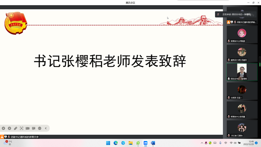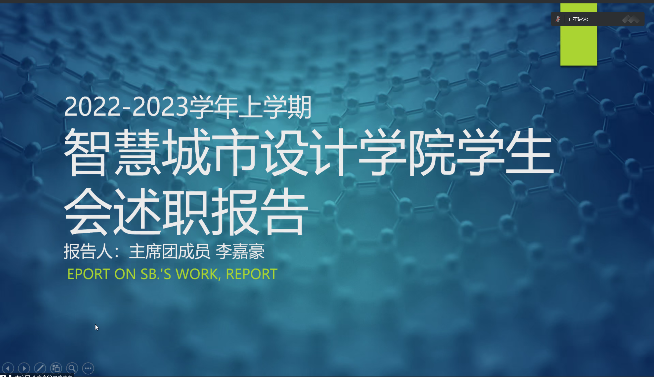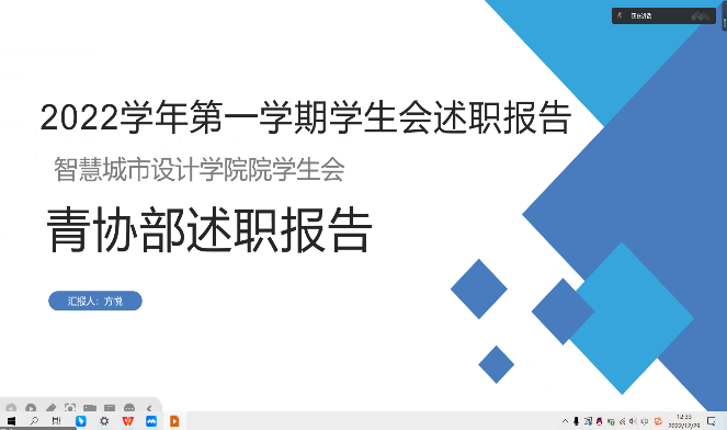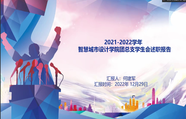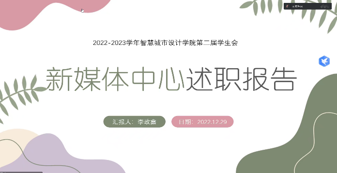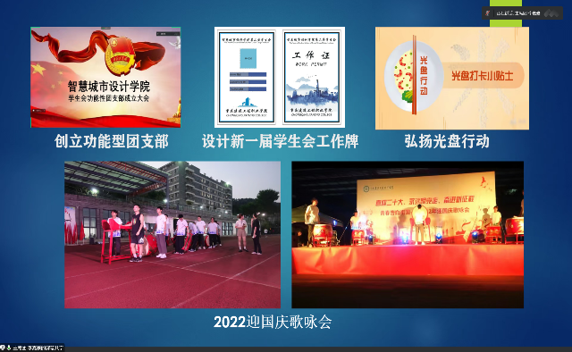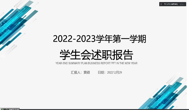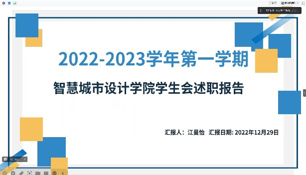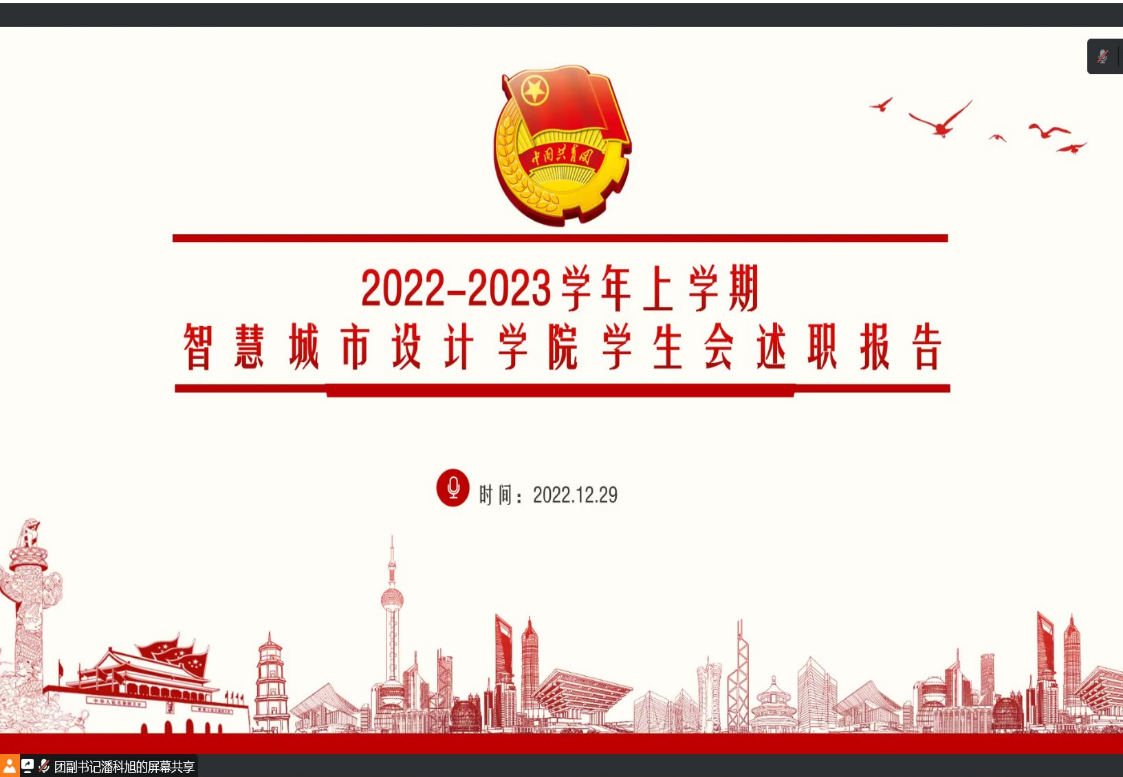 为了更好的推动学生会工作发展,进一步发挥学生骨干的模范带头作用,2022年12月29日,智慧城市设计学院2022-2023学年学生会第一学期工作述职评议大会采用腾讯会议在线上顺利召开。出席本次会议的有设计学院团总支书记张樱稆,以及全体学生会成员。