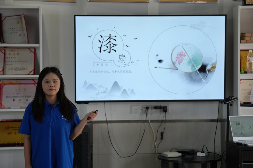 “小老师”通过一段精彩的非遗漆扇ppt,向孩子们介绍了漆扇悠久的历史和精湛的工艺。“小老师”用童趣的语言解读“漆扇”工艺的精妙之处,将复杂的技法转化为孩子们能理解的“魔法步骤”,孩子们听得津津有味,时不时举手发出好奇的疑问:“这个扇子弄上的颜色好漂亮哇,是用什么做的呀?”