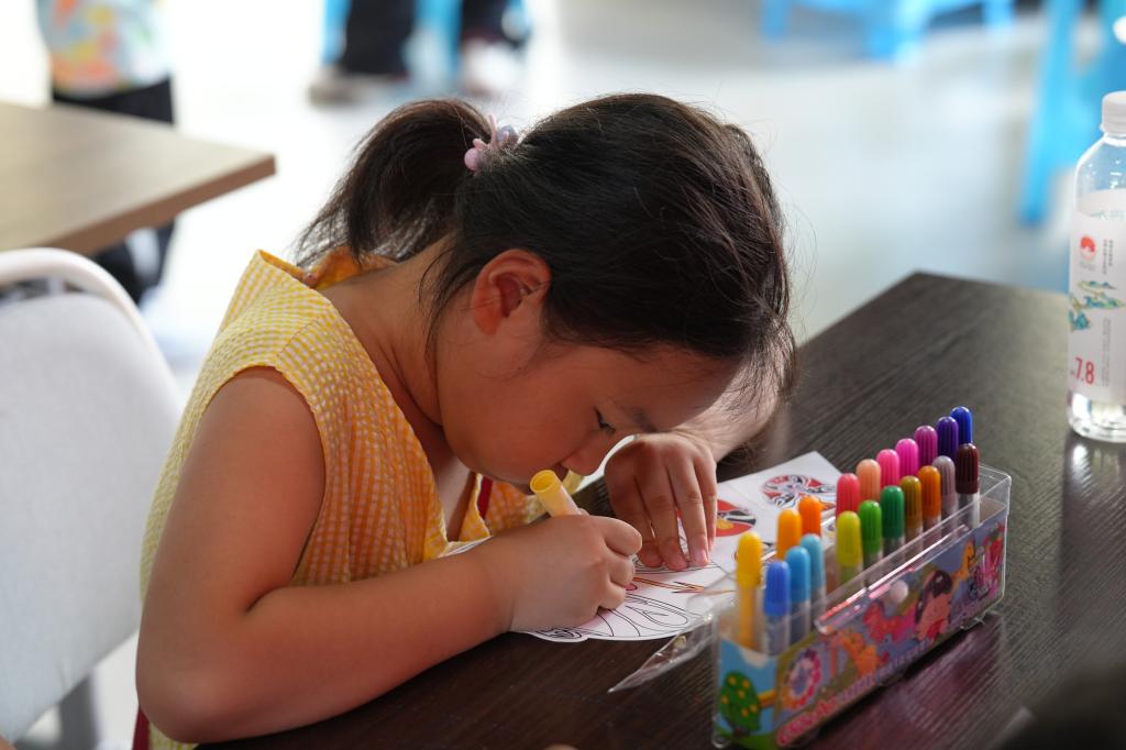“小老师”们还带领孩子们开展“心情脸谱”创作。5岁的小朋友用红色蜡笔涂满整个脸谱,又突然用黑色画了几道粗线。“这是生气的我,因为弟弟弄坏了我的画册”,在“小老师”的引导下,小朋友又添上黄色和蓝色:“现在它不生气了,因为弟弟后面跟我道歉了。”
