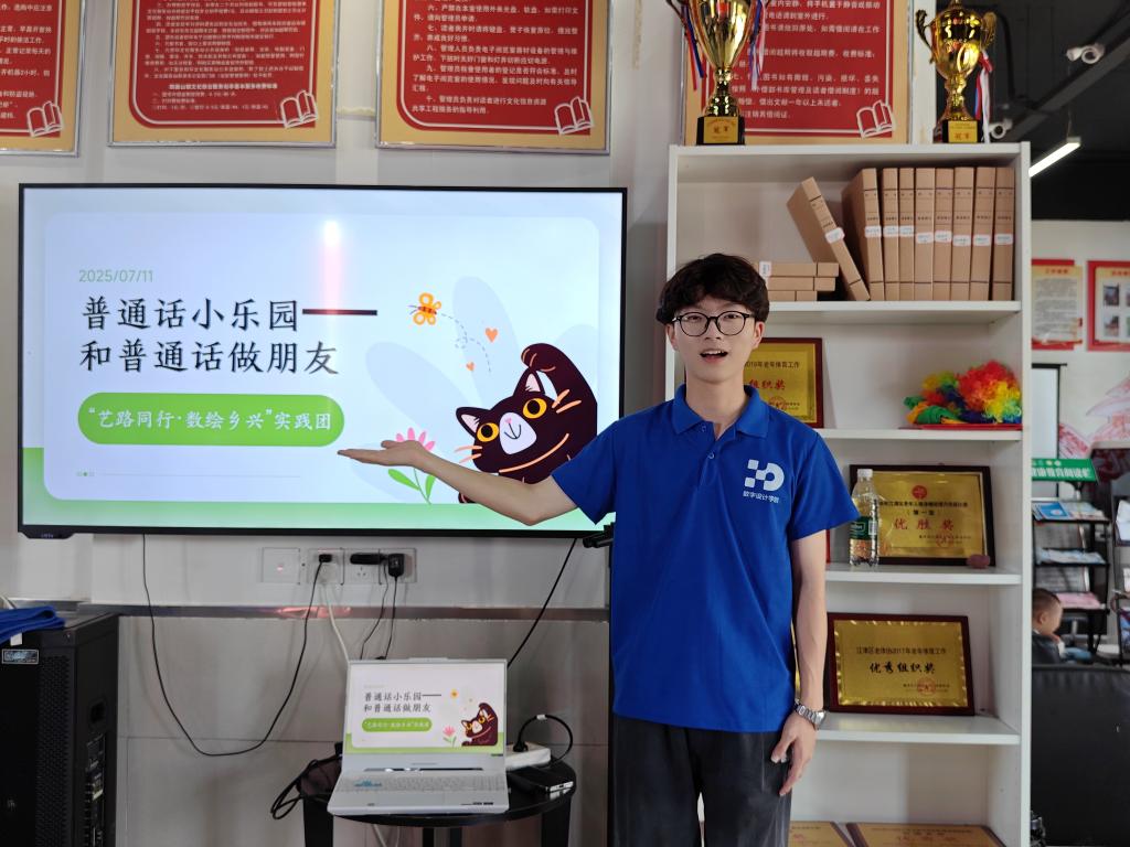 午热正酣,童声未歇。普通话小课堂上,针对不同年龄孩子语言基础差异,实践团成员实施个性化教学方案。在结对陪伴教学模式下,“小老师”走到孩子身边,耐心纠正发音,鼓励孩子大胆开口。课堂氛围热烈而温馨,孩子们积极参与普通话声调“魔法变变变”小游戏互动,稚嫩的童声与耐心的指导交织,在轻松愉悦中提升普通话水平,感受语言魅力。